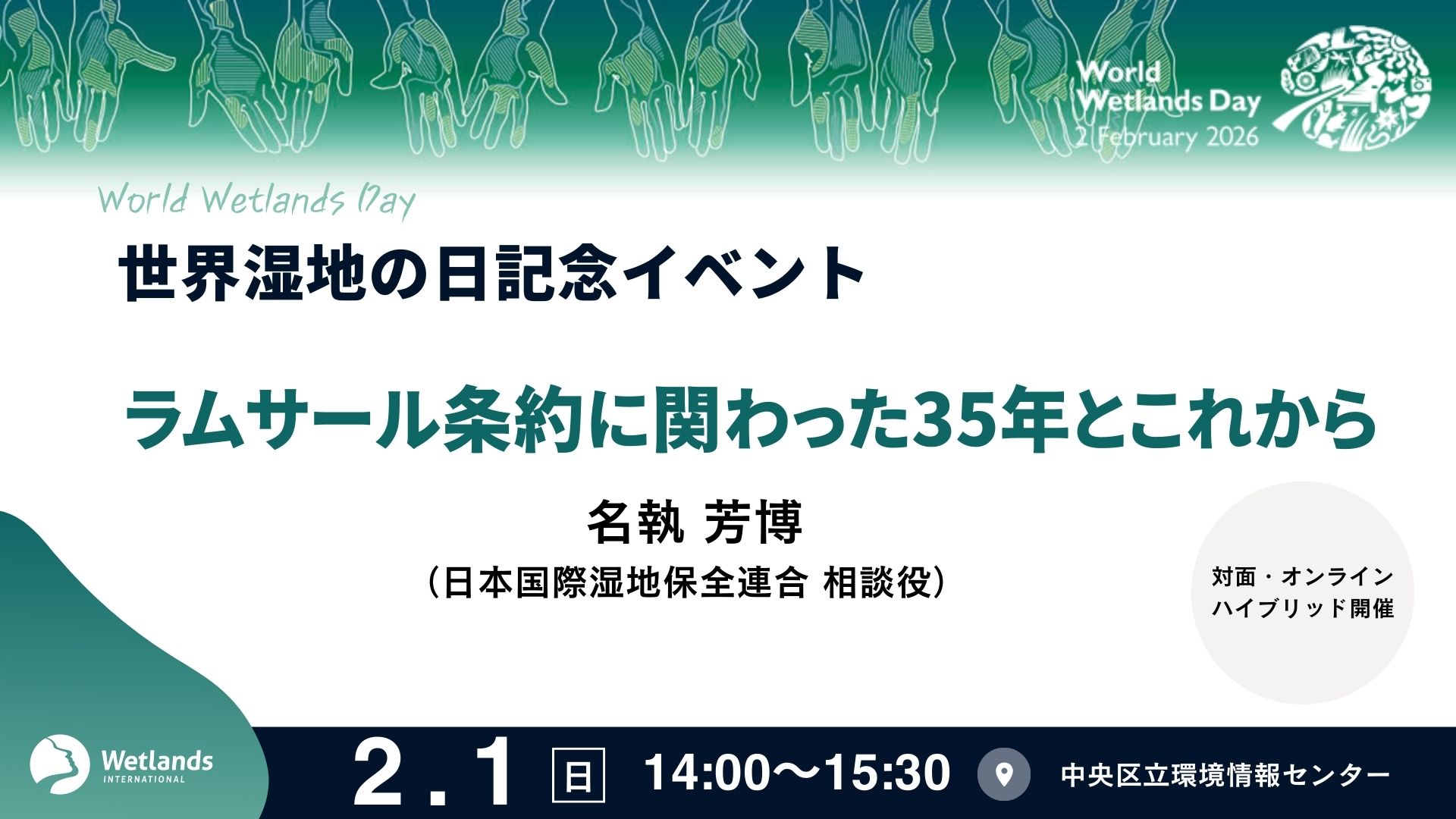 当団体は、日本におけるラムサール条約の推進や湿地保全の最前線で長年尽力してきた名執芳博さん(WIJ相談役)をゲストとして迎え、今年のテーマに併せたトークイベント「ラムサール条約に関わった35年とこれから」を開催しました。イベントは2月1日に中央区環境情報センター「エコノバ」の会場とオンラインのハイブリッド形式で行い、約30名の参加者と共に名執さんのこれまでの歩みを振り返りました。